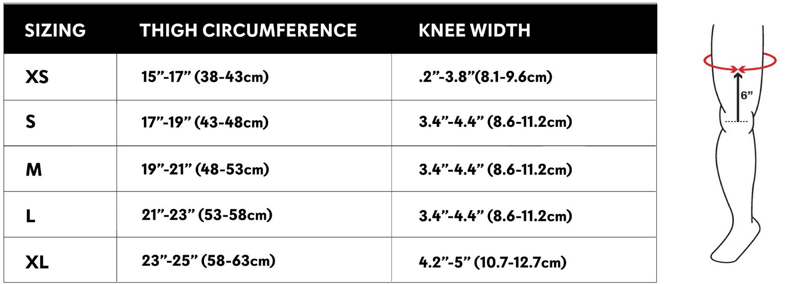 Measure from the center point of the kneecap to 6 inches up the thigh. Measure the circumference of your thigh at that point. With this measurement, follow the size chart below.